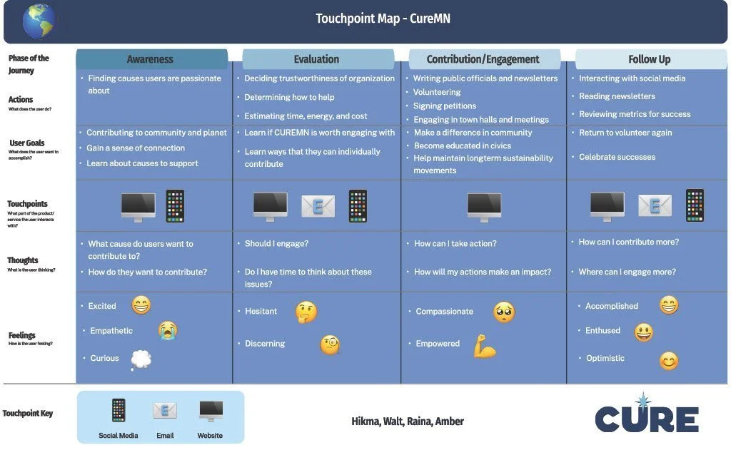 In the stakeholder interview, we learned that Cure is seeking to enhance their website’s dashboard and social media to effectively communicate their mission and draw in new members, more specifically expanding their user base to draw younger constitutes to their cause.