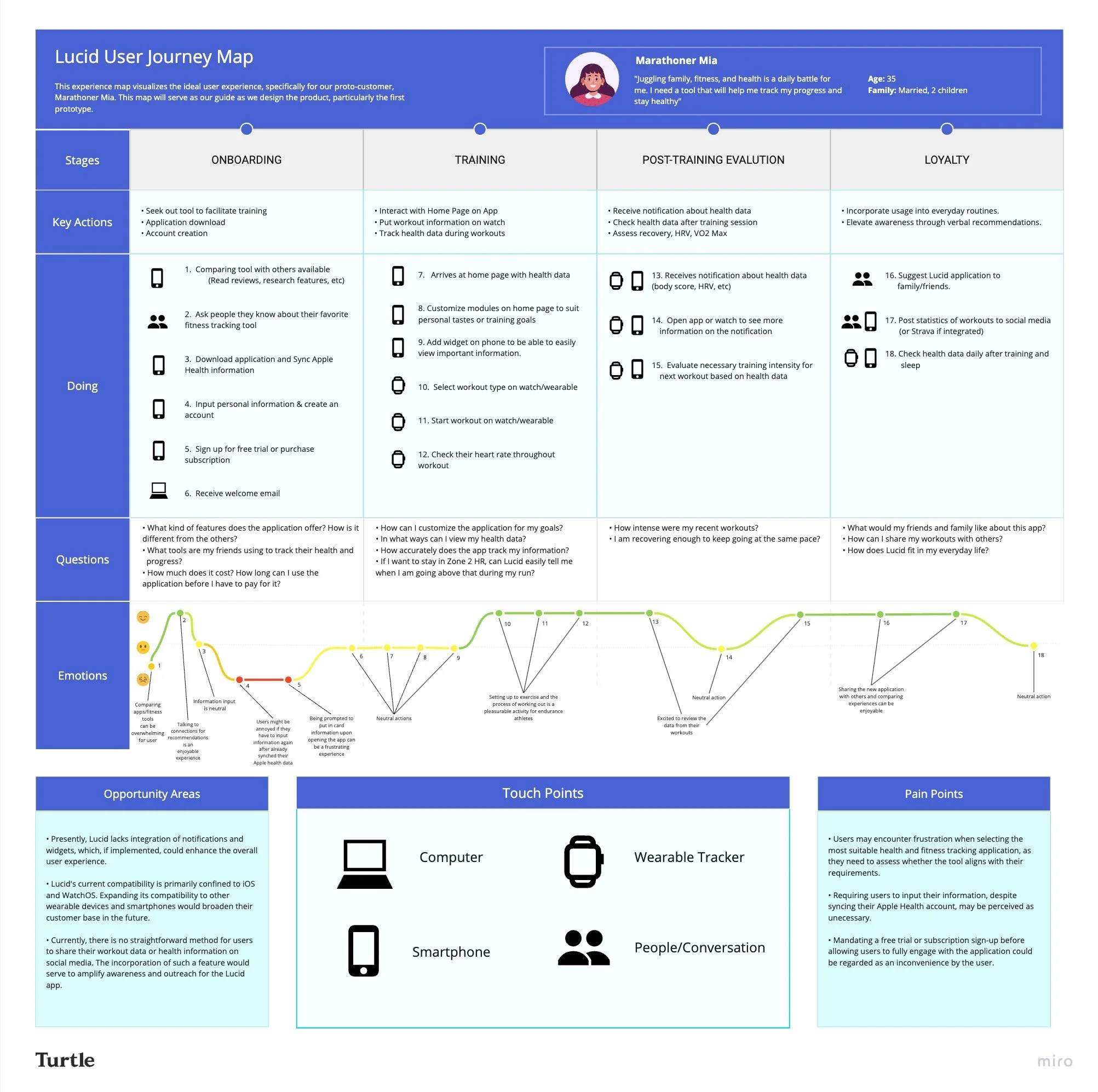 The purpose of the map was to provide a quick reference on how users interact with the product, as well as the feelings, thoughts, and questions that might arise during those interactions.